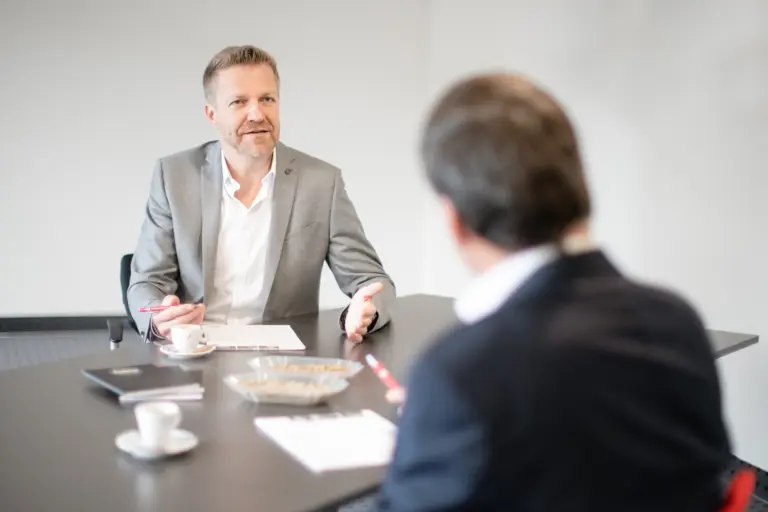 Nachhaltigkeits-Talk als Interview mit 3 Personen zum Segafredo Espresso Organico mit Kaffeesäcken im Hintergrund, Behind the scenes Foto